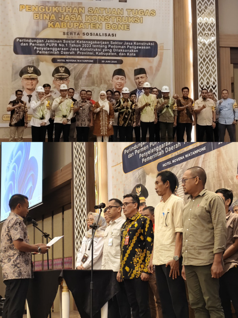 Pengukuhan ini menandai komitmen Pemkab Bone dalam meningkatkan standar keselamatan, profesionalisme, dan pengawasan di sektor jasa konstruksi.