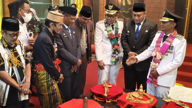 SULSEL_SULTRAKITA.COM, WATAMPONE — Bupati Bone Andi Asman Sulaiman menerima 12 Benda Pusaka Arajang di Museum Arajang Kompleks Rumah Jabatan (Rujab) Bupati Bone, Jalan Petta Ponggawae, Minggu (2/3).
