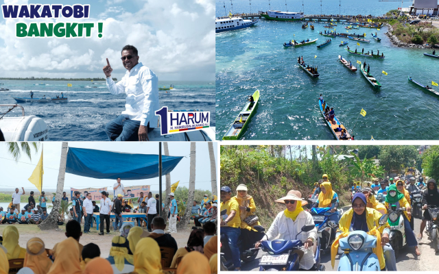 Penyambutan itu dimulai dari laut, saat kapal yang mengangkut Pasangan Harum dan rombongan memasuki pulau Kaledupa sekitar perairan Desa Mantigola dan Sama Bahari, ratusan perahu nelayan berjejer menyambut dan mengiringi kapal pasangan nomor urut satu ke pelabuhan ferry.