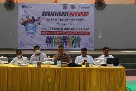 SULTRAKITA.COM, Kolaka – PT Antam UBPN Kolaka menggandeng Polres Kolaka mengedukasi pelajar tentang bahaya penggunaan narkoba. Kegiatan yang menghadirkan pelajar SMA dan SMP di Kecamatan Pomalaa serta Persatuan Wanita Aneka Tambang (PWAT) UBPN Kolaka digelar di Sport Center ANTAM Pomalaa, Kamis (11/5/2023).