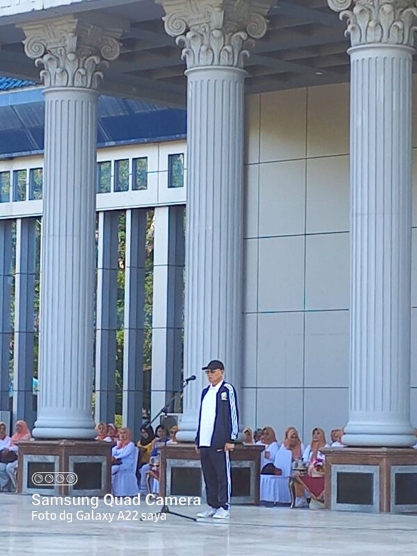 Pj Sekda Sultra, Drs Asrun Lio MHum PhD saat memimpin sekaligus membuka secara resmi senam massal peringatan HUT ke-23 DWP Provinsi Sultra Tahun 2022, Jumat (11/11), bertempat di Lapangan Upacara Kantor Gunernur Sultra.