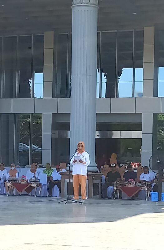 Ketua Dharma Wanita Persatuan (DWP) Provinsi Sultra, Dra Wa Ode Munanah Asrun Lio saat memberikan sambutan dalam kegiatan senam massal peringatan HUT ke-23 DWP Provinsi Sultra Tahun 2022, Jumat (11/11), bertempat di Lapangan Upacara Kantor Gunernur Sultra.
