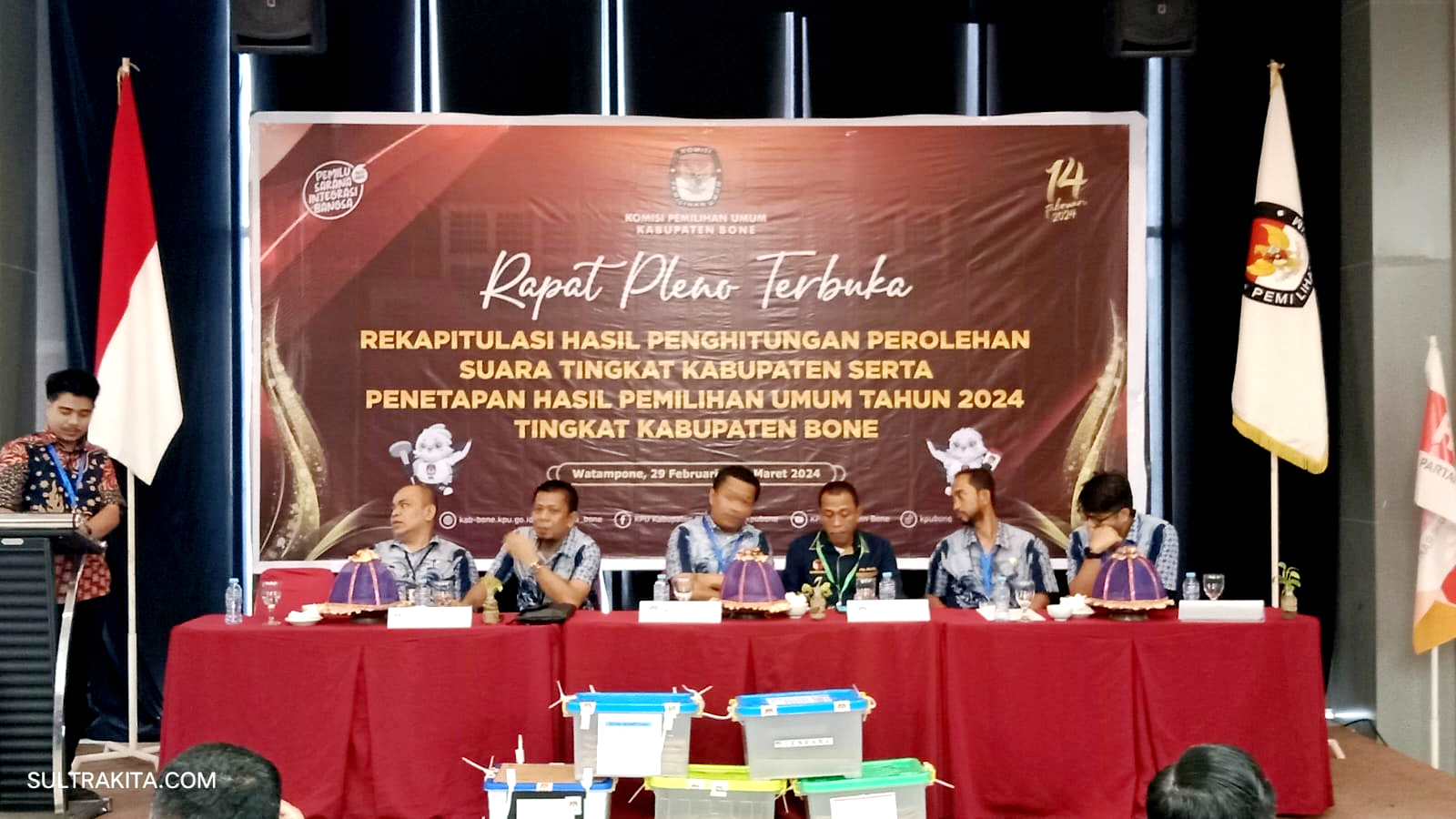 SULTRAKITA.COM, WATAMPONE — Komisi Pemilihan Umum (KPU) Kabupaten Bone menggelar Rapat Pleno Terbuka Rekapitulasi Hasil Penghitungan Perolehan Suara Tingkat Kabupaten.