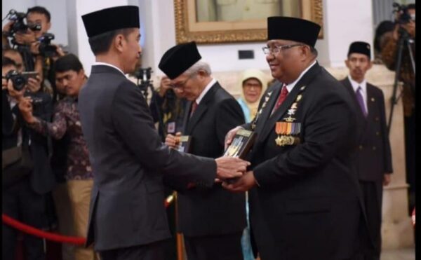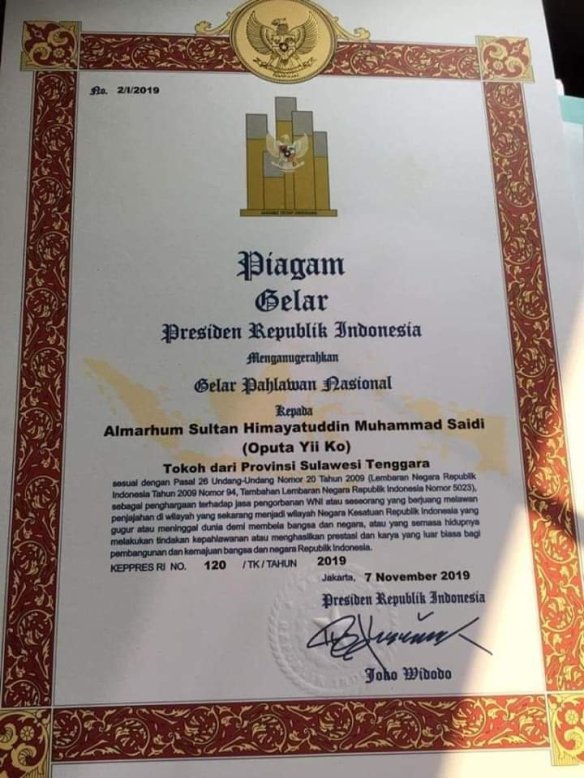 Gubernur Sultra, H Ali Mazi SH yang juga ahli waris, usai menerima Surat Keputusan (Keppres) Nomor 120/tk/2019 Tanggal 7 November 2019 dari Presiden RI, Ir H Joko Widodo, terkait penobatan Sultan Himayatuddin Muhammad Saydi sebagai pahlawan nasional.