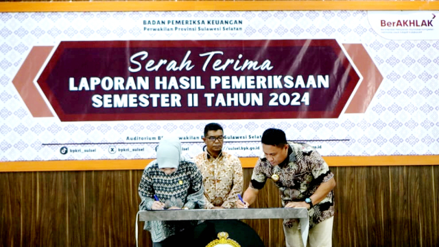 Laporan hasil pemeriksaan diserahkan oleh Kepala BPK Perwakilan Sulsel Amin Adab Bangun kepada Penjabat (Pj) Bupati Bone Andi Winarno Eka Putra dan Ketua DPRD Bone Andi Tenri Walinonong di Auditorium Kantor BPK Perwakilan Sulsel di Jalan AP Petta Rani Makassar, Rabu (08/1).
