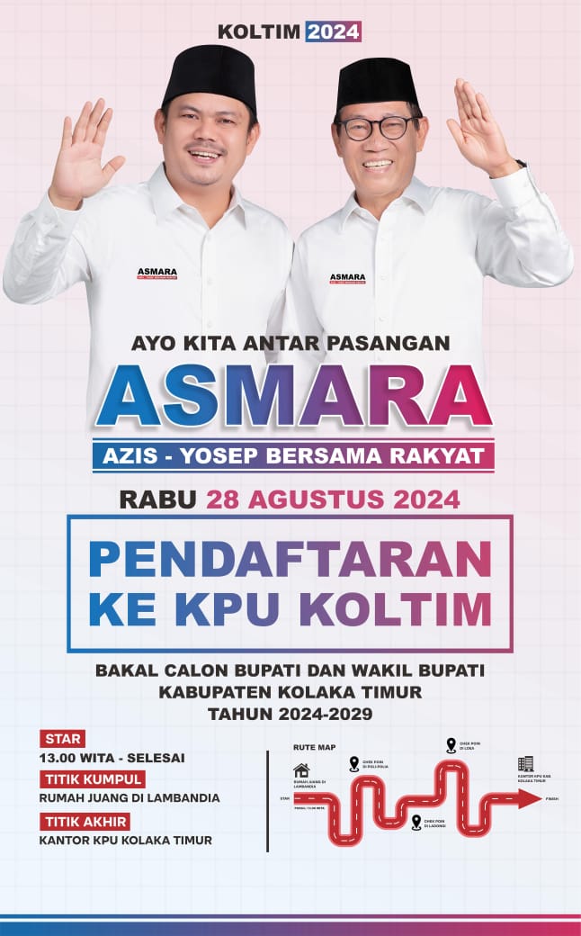 SULTRAKITA.COM, TIRAWUTA – Pasangan Abd Azis dan Yosep Sahaka (ASMARA) akan menggelar deklarasi maju sebagai calon bupati dan wakil bupati pada Pemilihan Kepala Daerah (Pilkada) Kolaka Timur, Rabu (28/8). Rumah Juang yang bertempat di Desa Lambandia Kecamatan Lambandia akan menjadi sentral deklarasi paslon ASMARA, sekaligus mendaftar ke KPU Koltim.
