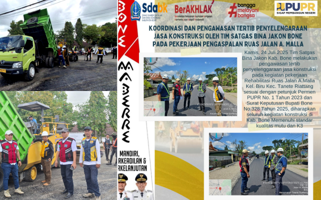 Olehnya itu Bupati Bone melalui Dinas Sumber Daya Air dan Bina Konstruksi (SDABK), menurunkan Satgas Bina Jakon untuk memastikan proyek pengaspalan berjalan sesuai Peraturan Menteri PUPR Nomor 1 Tahun 2023 dan SK Bupati Bone Nomor 328 Tahun 2025.