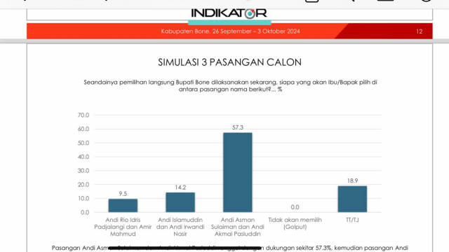 Dalam survey yang digelar 26 September–3 Oktober itu, menempatkan Pasangan Calon (Paslon) Bupati dan Wakil Bupati Bone Andi Asman Sulaiman–Andi Akmal Pasluddin (Beramal) dengan raihan 57,3 Persen.
